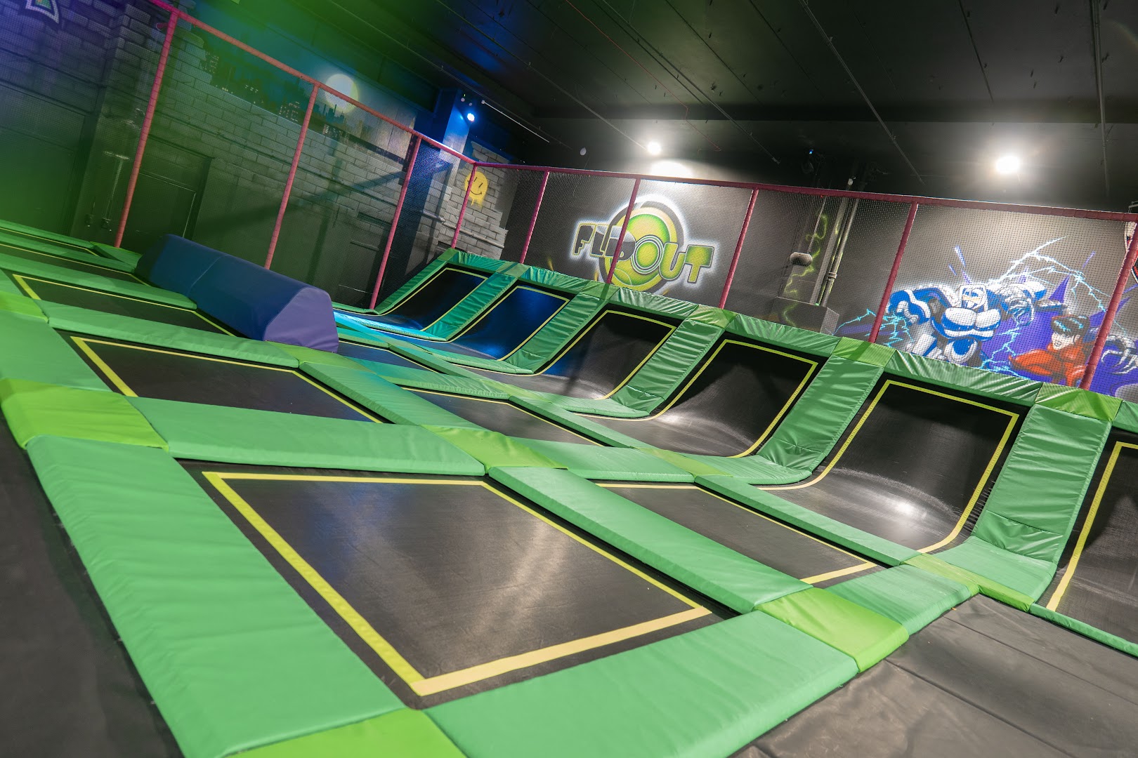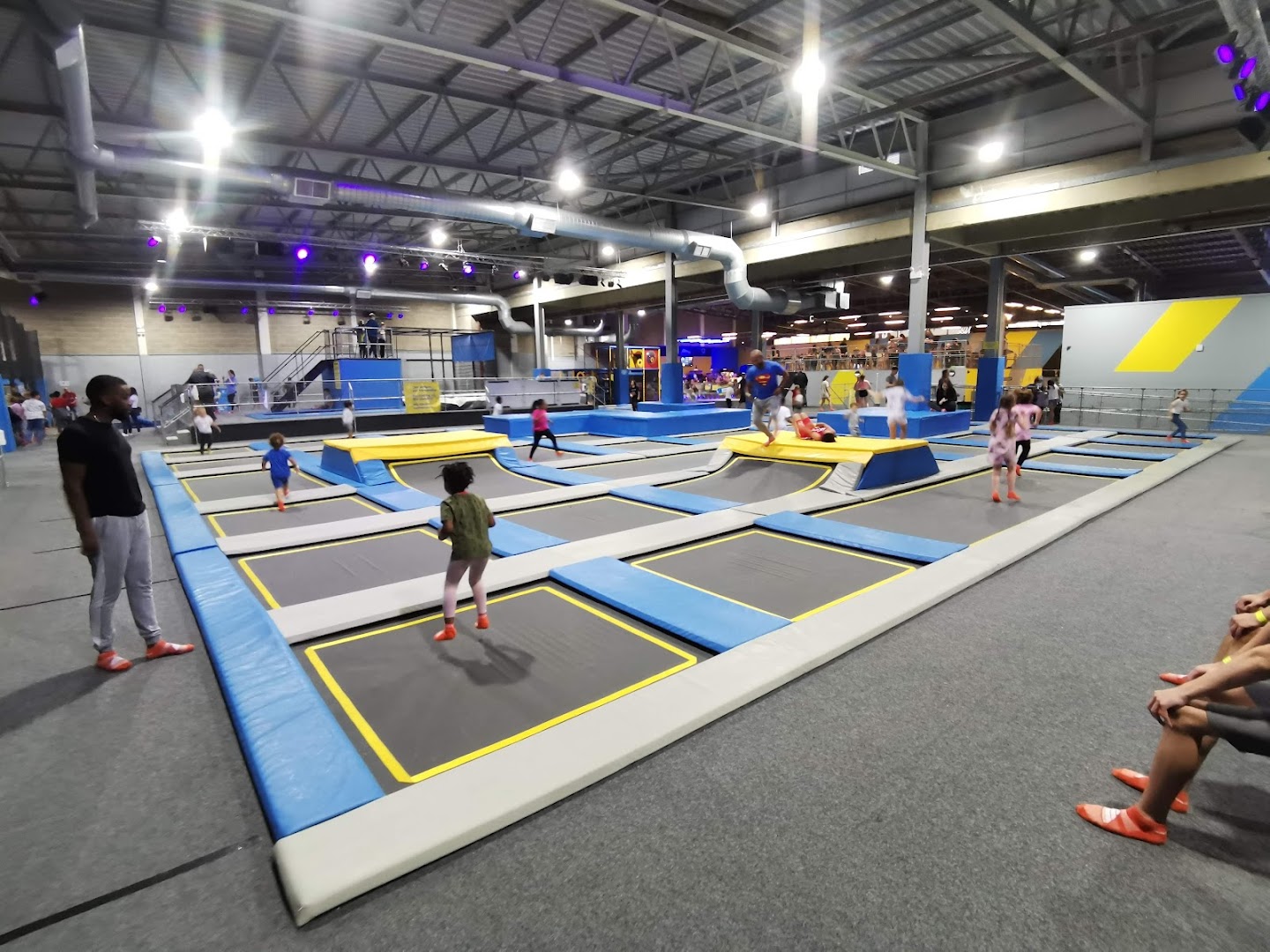 Access to over 60 interconnected trampolines, dodgeball, slam-dunk basketball, parkour obstacle course, 8 climbing walls, mega airbag, reaction walls and massive inflatable play area
